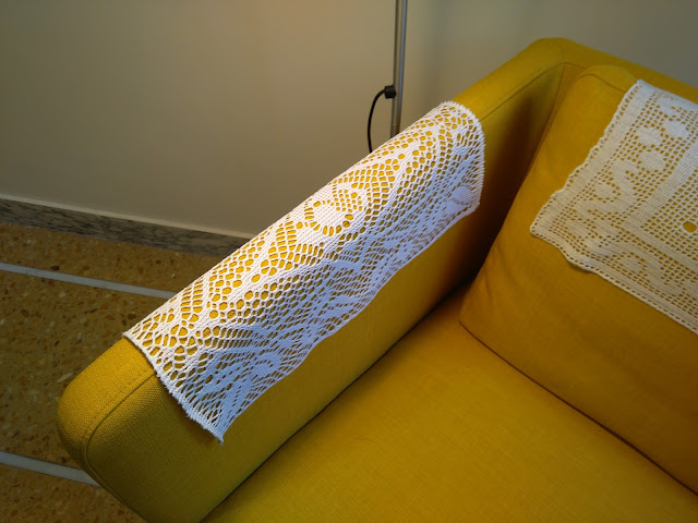Este silloncito de Ikea, que he montado con mis propias manos, ha quedado estupendo con estos tres pañitos, cada uno de su padre y de su madre.